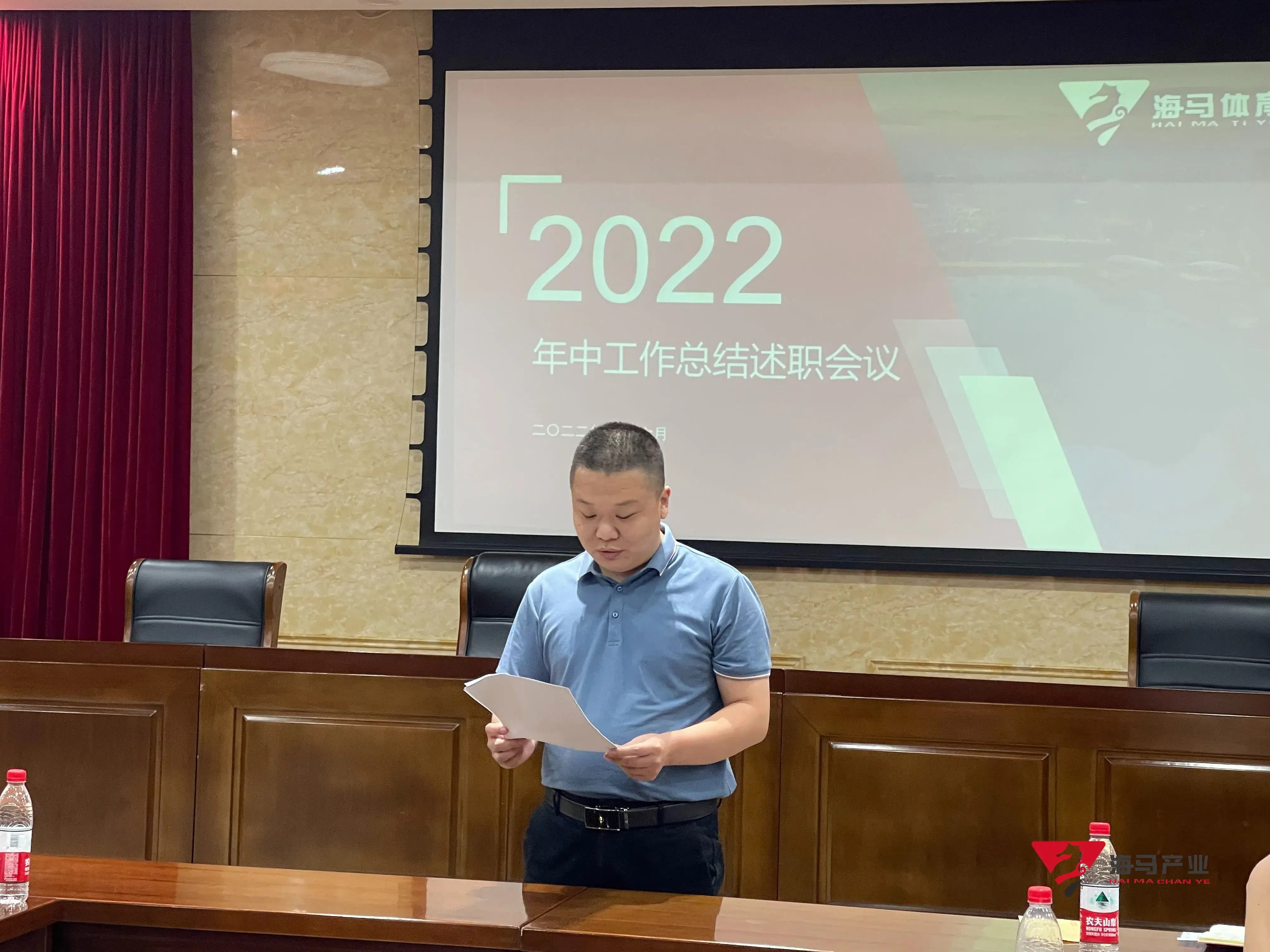2022年6月29日下午,新宝GG文化产业集团在山东省体育中心二楼会议室召开年中工作总结述职会议,会议对上半年工作成果进行了总结汇报,并就下半年重点工作进行部署。总经理王海民出席了本次会议。会议由综合管理部负责人王永健主持。
